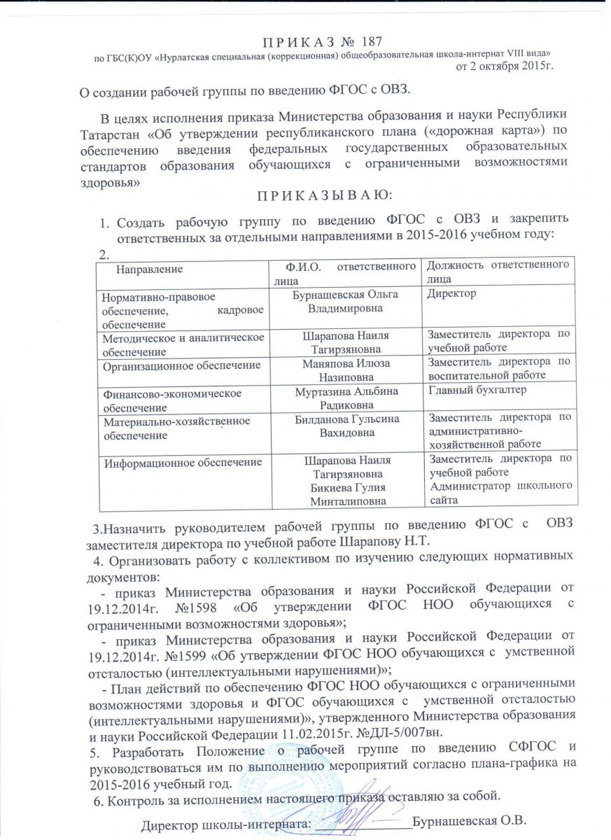 Приказ №187 от 2 октября 2015 г "О создании рабочей группы по введению ФГОС с ОВЗ"