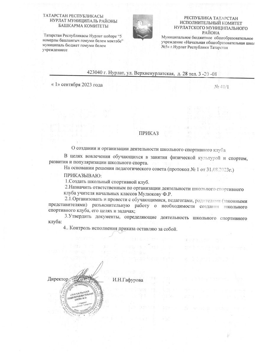 Приказ о создании школьного спортивного клуба "Здоровей-ка"