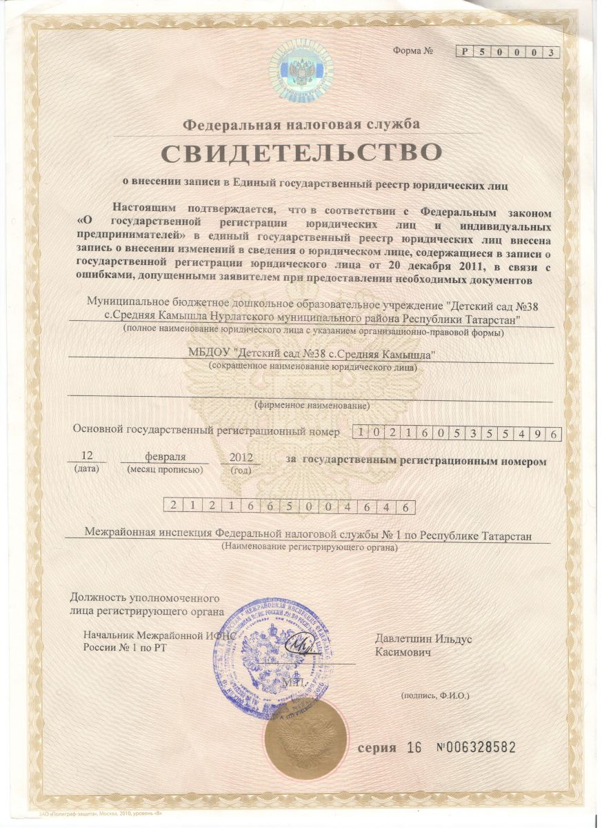 Свидетельство о внесении записи в Единый государственный реестр юридических лиц