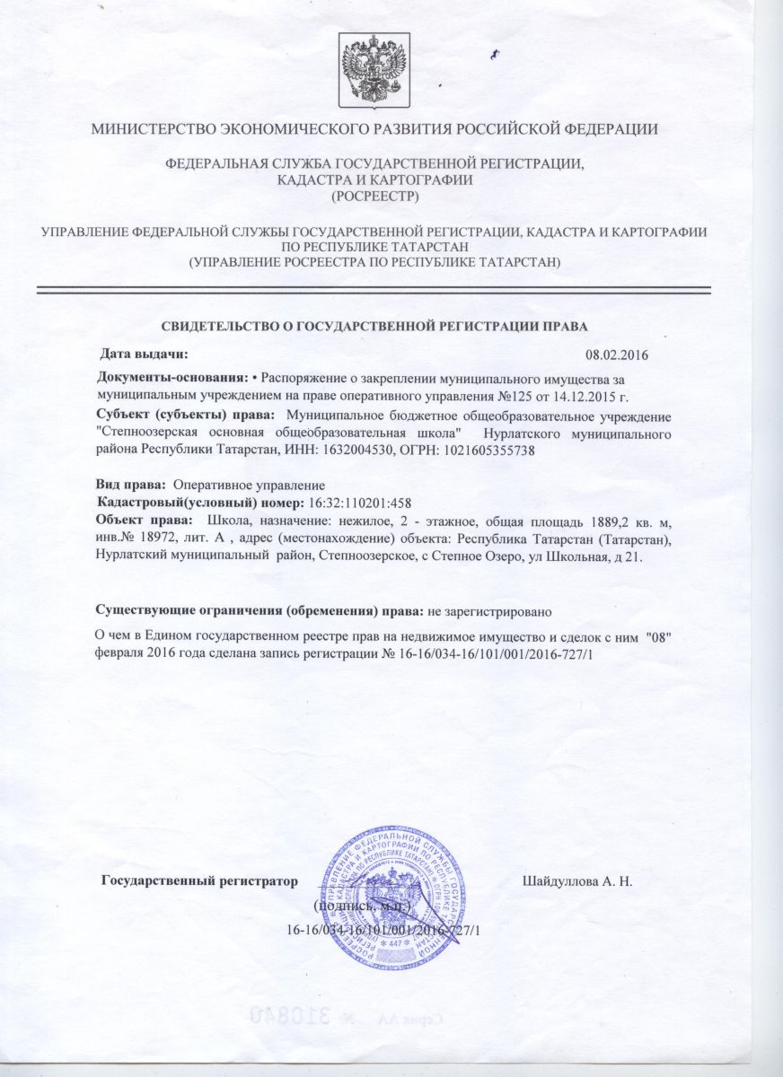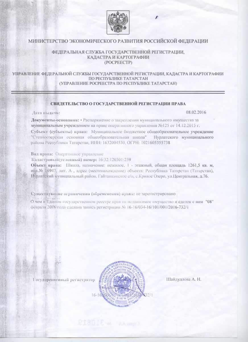 Свидетельство о государственной регистрации права /на школу с.Степное Озеро/