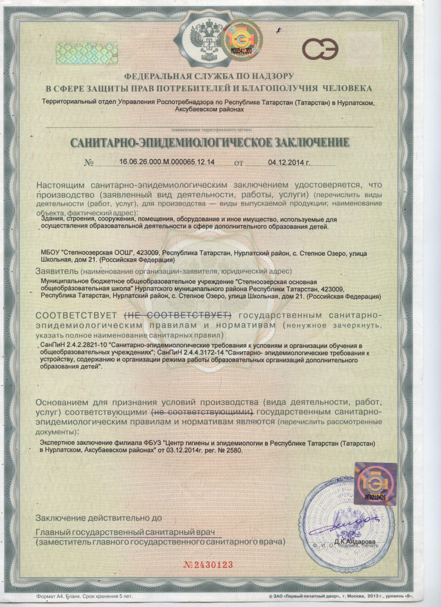 Санитарно-эпидеомологическое заключение от 04.12.2014 г.