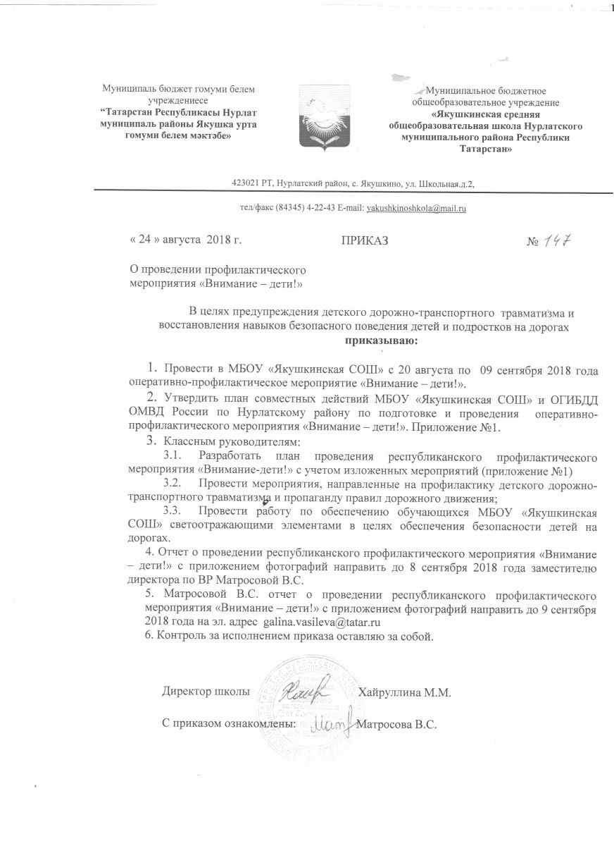 Приказ о проведении профилактического мероприятия "Внимание - Дети!" / "Игътибар - балалар!"профилактик чаралар үткәрү турында боерык