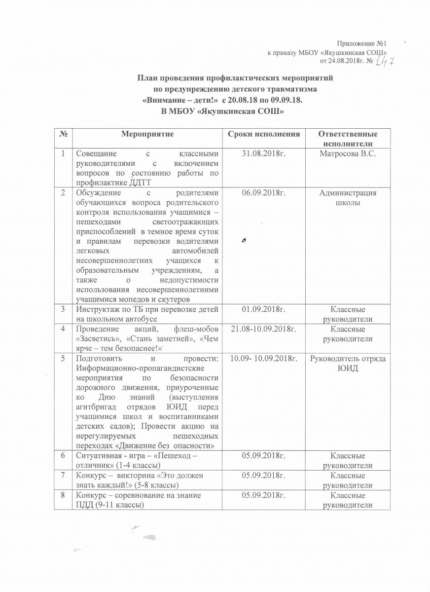 План проведения профилактичекских мероприятий по предупреждению детского травматизма "Внимание - дети!" с 20.08.2018 по 09.09.2018 в МБОУ "Якушкинская СОШ"/ 20.08.2018 дан 09.09.2018 га кадәр "Якушка урта мәктәбе"ндә "Игътибар- балалар!" балалар травматизмын кисәтү буенча профилактик чаралар үткәрү рланы