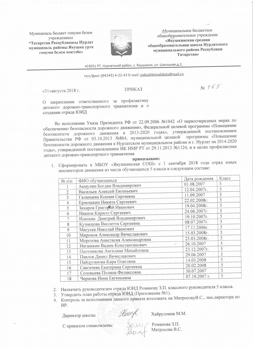 Приказ о закреплении ответственного за профилактику детского дорожно- транспортного травматизма и о создании  отряда ЮИД / ЮИД отрядын төзү һәм балалар юл-транспорт травматизмын профилактикалау максатыннан җаваплы кеше беркетү турында боерык