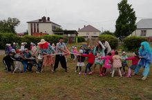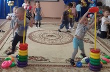 Спортивное развлечение проводилось на улице. Проводились различные игры и конкурсы для детей. Таким образом развивались основные качества: ловкость, быстрота, сила, выносливость, координация движений; дети приобщались к занятиям физкультурой и спортом, к здоровому образу жизни; воспитывались целеустремленность, настойчивость, чувство коллективизма. // Спорт чарасы урамда үткәрелде. Балалар өчен төрле уеннар һәм конкурслар үткәрелде. Шулай итеп, төп сыйфатлар: җитезлек, тизлек, көч, чыдамлык, хәрәкәтләрне координацияләү, максатчанлык, үҗәтлек, коллективизм хисе тәрбияләнделәр; балалар физкультура һәм спорт белән шөгыльләнүгә, сәламәт яшәү рәвешенә тартылдылар.