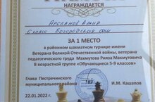 Поздравляем победителя районного шахматного турнира! 22.01.2022