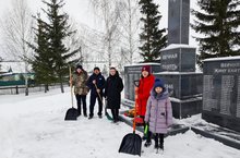 Учащиеся вооружившись лопатами и метлами, аккуратно и старательно очистили от снега территорию, прилегающую к памятнику воинам, павшим за Родину. -