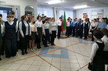 Линейка 06.02.2023 Очередная учебная неделя началась в школе с вноса флага и исполнение гимна РФ и РТ.