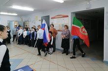 23 января в школе прошла очередная линейка, посвящённая вносу флагов РФ и РТ и пению гимнов.