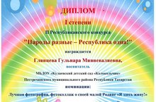 Поздравляем победителей 11 Республиканского конкурса «Народы разные-Республика одна!» воспитателей ясельной и второй младшей группы Глянцеву Гульнару и Антонову Татьяну./ "Халыклар төрле-Республика бер!» ясель һәм икенче кече төркем тәрбиячеләре Глянцева Гөлнара һәм Антонова Татьяна.