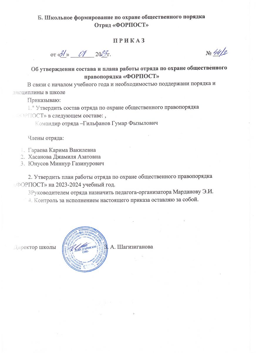 Приказ "О формировании "Форпост" на 2023-2024 уч. год