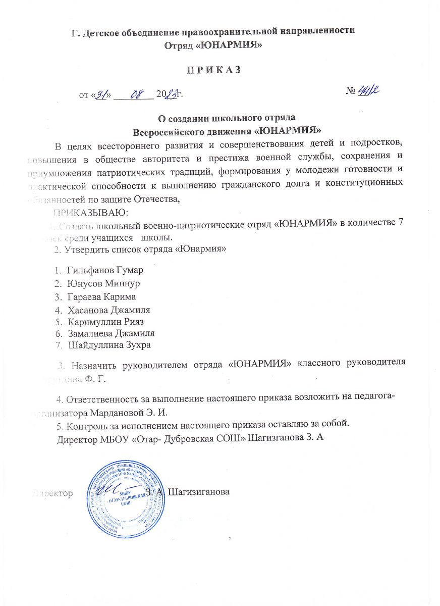 Приказ "О формировании юнармейского отряда" на 2023-2024 уч. год