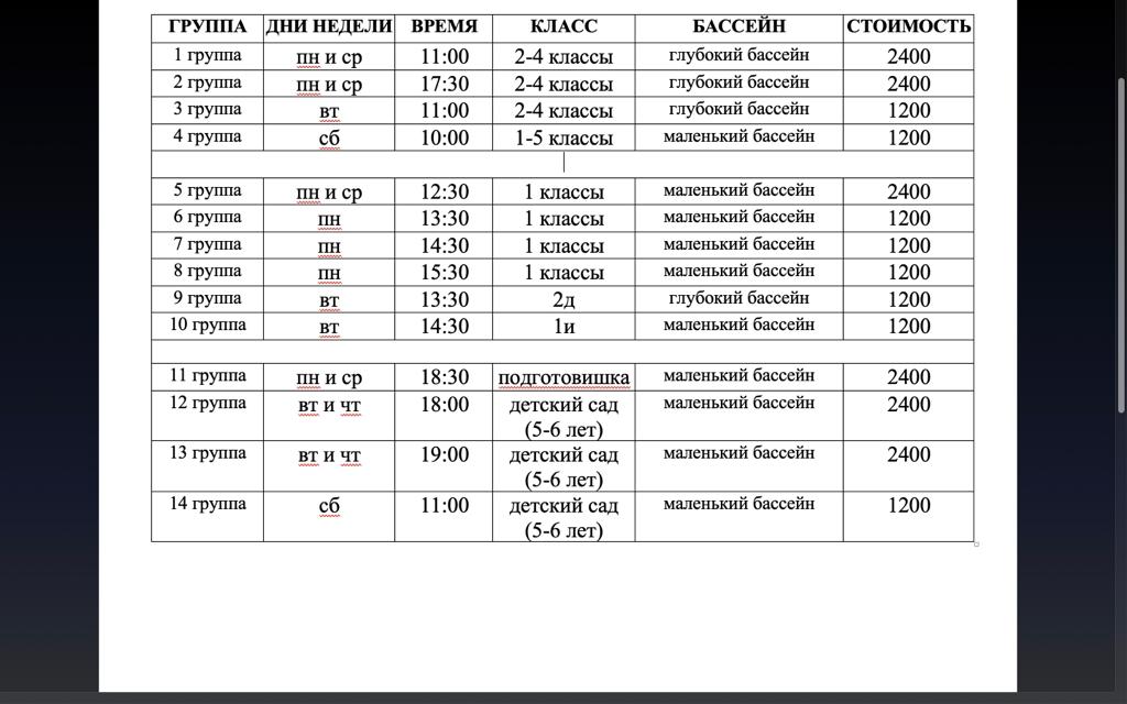 РАСПИСАНИЕ ЗАНЯТИЙ ПО ПЛАВАНИЮ -БАССЕЙН 1 ПОЛУГОДИЕ 2023-2024 УЧЕБНОГО ГОДА (ВНЕБЮДЖЕТ)