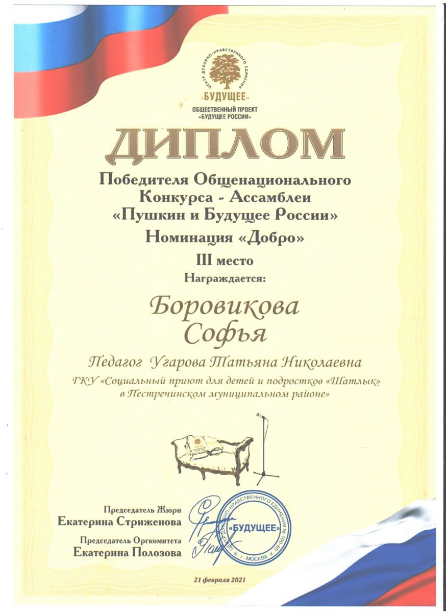 | Диплом Победителя Общенационального конкурса-ассамблеи "Пушкин и будущее России" |