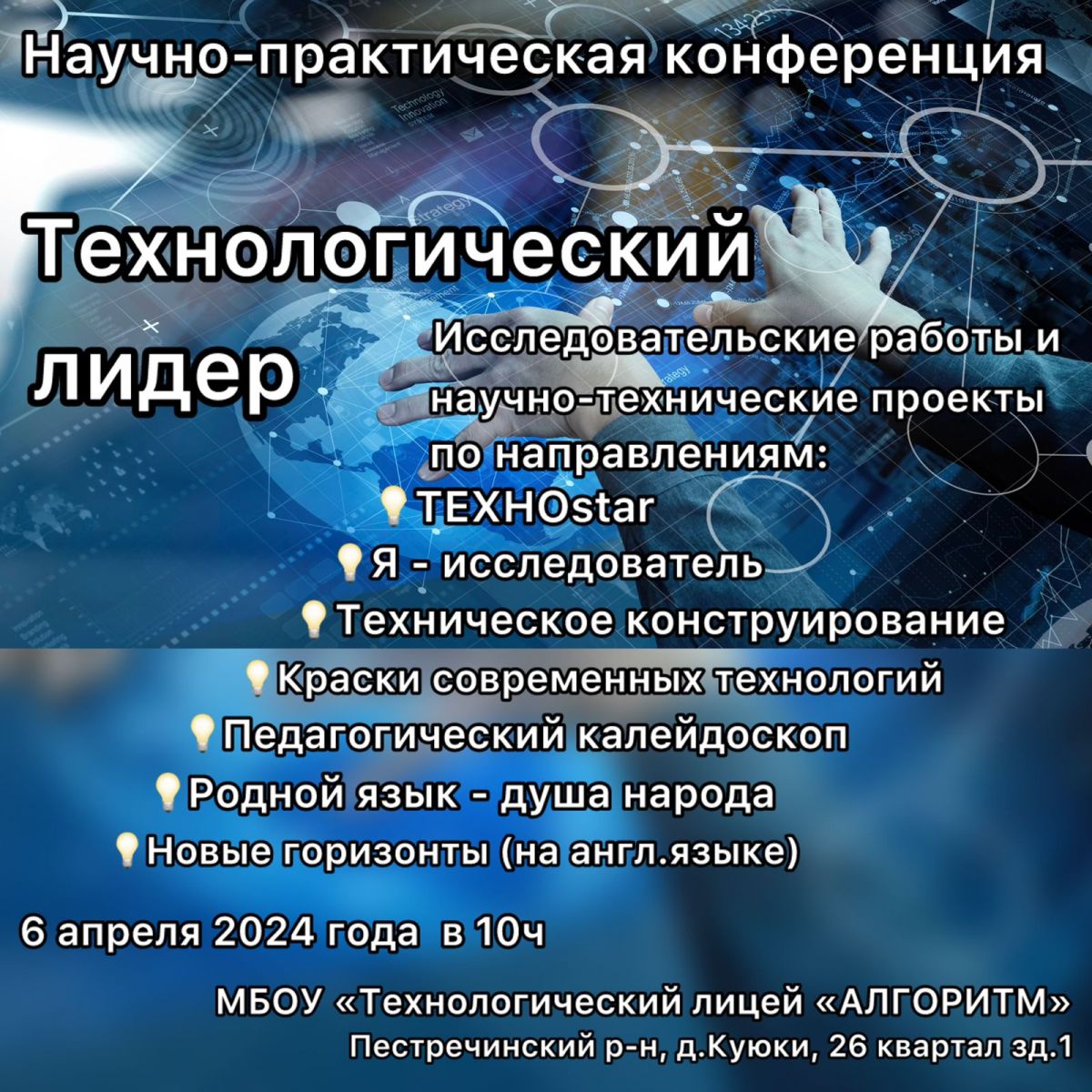 6 апреля 2024 года в лицее «Алгоритм» проводится районная научно-практическая конференция «Технологический лидер».
