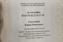 Поздравляем Гизутдинова Карима, учащегося 8 класса Ленино-Кокушкинкой СОШ , учитель - Ахметзянов Зефир Загидович, который стал призером Республиканской олимпиады по географии! Молодцы!