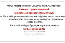 МБОУ «Пестречинская СОШ№1 им.И.А.Додосова»Начинает прием заявленийна платные образовательные услуги- «Школа будущего первоклассника» (развитие математических способностей, развитие речи, развитие творческих способностей)- Английский для будущих первоклассниковС 18 сентября 2023гОбращаться по телефону 89375703004 (Сайфутдинова Елена Владимировна)Понедельник-пятница с 9.00 до 15.00 -