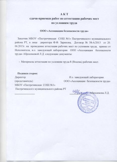 Акт сдачи - приемки работ по аттестации рабочих мест по условиям труда