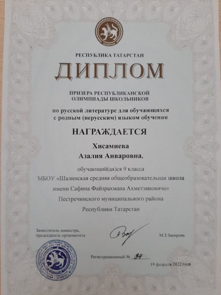 Хисамиева Азалия , призер республиканской олимпиады школьников по русской литературе для учащихся школ с родным (нерусским) языком обучения