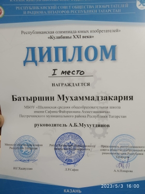 Учащиеся 11 класса Батыршин М. участвовал республикой олимпиады юных изобретателей "Кулибины XXI века"