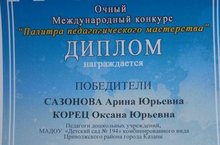Поздравляем Победителей номинации "Портфолио педагога" очного Международного конкурса "Палитра педагогического мастерства" педагога - психолога Сазонову Арину Юрьевну и старшего воспитателя Корец Оксану Юрьевну!