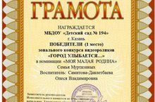 Коллектив детского сада № 194 от всей души поздравляют семью Муртазиных с победой, 1 место в зональном республиканском конкурсе видеороликов "Город улыбается" в номинации "Моя малая Родина", куратор: воспитатель Самитова - Давлетбаева Олеся Владимировна.