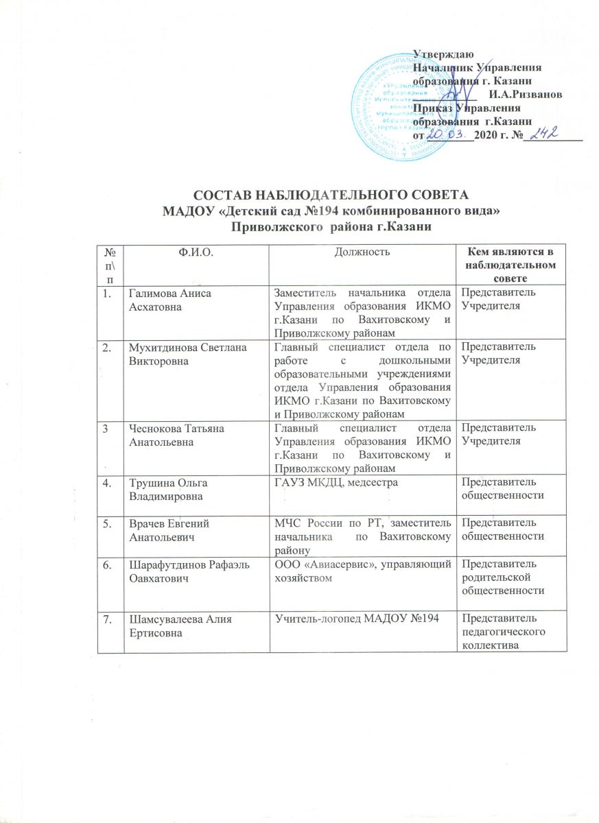 Состав наблюдательного совета МАДОУ № 194 от 20.03.2020 г.
