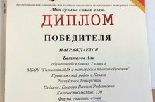 2нче В сыйныфы укучысы Хуббутдинова Камила -173 балл (җитәкчеләре Егорова Р.Р.) җиңүче булып танылдылар. Әфәрин, укучылар !!! Тагында зур уңышларга ирешүегезне телибез.