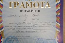 Гимназиябезнең 10 сыйныф укучысы Мәхмүтова Адилә үзенең туган теле һәм әдәбияты укытучысы Вәлияхмәтова Гөлназ Мәҗит кызы белән бергә укучылар өчен "Петровские чтения" ачык фәнни - гамәли конференциясендә катнашты . Чараны оештыручылар – мәгариф һәм һөнәри юнәлеш бирү эше университеты, «ТИСБИ» идарә Үзәге, Казан шәһәре Вахитов һәм Идел буе районнары мәгариф бүлеге һәм Казан шәһәре Вахитов районы МББУ«Гимназия № 96». Конференциядә уңышлы чыгышы белән һәм III –дәрәҗә җиңүче дипломы белән Адиләне һәм җитәкчесен котлыйбыз. Молодцы!!! Афәрин !!!
