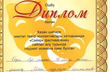 Казан шәһәре мәктәп театр коллективлары катнашында "Сәйяр" фестиваленең сайлап алу турында ЛАУРЕАТ исеменә лаек булган 18нче гимназиянең "Кояш нурлары" коллективы (4А сыйныф, кл.җитәкчеләре Хуснутдинова Р.Ф.) ДИПЛОМ белән бүләкләнде.
