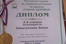 Ученица 2 класса Самигуллина Амина награждена ДИПЛОМОМ 2й степени за участие в Российском турнире по спортивным танцам на паркете "Родник здоровья" (Тренеры: Савинов И., Марданова А.; кл.руководитель Кадырова Р.Р.)