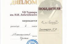Ученик 6 класса Миннахметов Булат награжден ДИПЛОМОМ ПОБЕДИТЕЛЯ VII Турнира им. Н.И.Лобачевского (учитель Саттарова Р.Д.). МОЛОДЕЦ!!! ПОЗДРАВЛЯЕМ!!!