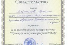 Ученицы 8 класса Алехина Дария и Закиева Эльвира приняли участие во II Республиканском конкурсе рисунков "Правнуки ветеранов рисуют Победу" и были награждены свидетельствами за участие в данном конкурсе.