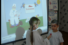 Учитель начальных классов Сабирова Гульчачак Мансуровна провела в своем 1Б классе очень интересный урок на тему: "Путешествие с Доктором Айболитом". К этому уроку она сделала очень красочную презентацию, которая познакомила детей профессией врача. Дети на этом уроке развивали слуховое внимание и память, путем названия предметов для лечения куклы, сами слушали через фонендоскоп биении сердца друг друга, измеряли температуру. .