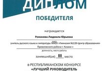 В апреле Институт развития образования РТ проводил конкурс «Лучший руководитель районного методического объединения» с целью выявления и поддержки лучшего опыта работы руководителей районных и городских методических объединений, повышения профессионального мастерства педагогов в рамках реализации НСУР. Призером данного конкурса стала руководитель РМО учителей русского языка и литературы Приволжского района г.Казани, заместитель директора по УР МАОУ «Гимназия 139-Центр образования» Романова Л.Ю. Людмила Юрьевна под руководством заведующей УМС ИМО Павловой Валентины Степановны представила презентацию портфолио методического объединения и авторский методический проект, направленный на формирование профессиональных компетенций педагога. В результате в Республиканском конкурсе заняла 3 место в номинации « Лучший руководитель методического объединения гуманитарного цикла». Поздравляем Людмилу Юрьевну, желаем дальнейших творческих успехов и реализации всех планов.