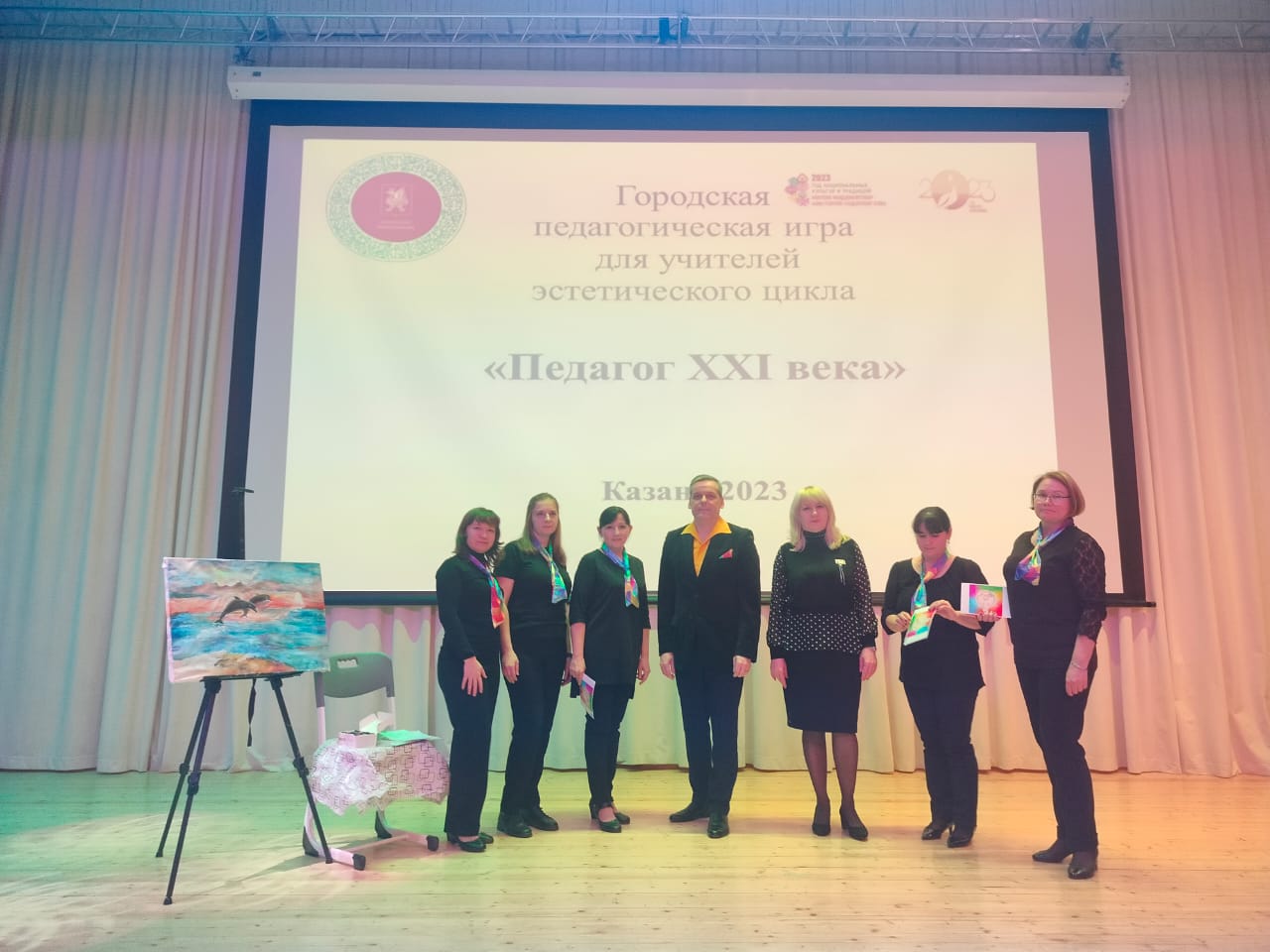 Опубликовано: 24.11.2023Городская педагогическая игра «Педагог XXI века» для учителей эстетического цикла г.Казани состоялась 24 ноября на базе МБОУ «Многопрофильный лицей №187» Советского района г.Казани. В конкурсе приняли участие четыре команды: Советского, Ново-Савиновского-Авиастроительного, Кировского-Московского, Вахитовского-Приволжского районов. Активное участие в соревновании от Вахитовского и Приволжского районов приняли: учитель музыки МБОУ «Гимназия №28» Самигуллина Руфина Ильдаровна, учитель музыки МБОУ «Школа №80» Самигуллина Рузалия Ильдаровна, учитель музыки МБОУ «Гимназия №40» Власова Елена Александровна, учитель изобразительного искусства и технологии МБОУ «Гимназия №27» Габитова Резеда Айдаровна, учитель изобразительного искусства МБОУ «Гимназия №52» Семенова Екатерина Александровна, учитель музыки и изобразительного искусства МБОУ «Лицей №35-ОЦ-Галактика» Ильичев Евгений Михайлович. Игра была направлена на раскрытие творческого потенциала учителей музыки и изобразительного искусства, на укрепление профессиональных связей между образовательными организациями г.Казани. Команды участвовали в 3 конкурсных заданиях: «Визитка команды», мастер-класс «Я знаю, как это сделать. Я научу вас», творческий проект «Венок дружбы народов». Игра «Педагог XXI века» прошла очень ярко, талантливо! Все стали победителями!