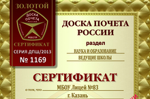 МБОУ "Лицей №83" внесен в Федеральный электронный Реестр "Доска почета России". Сертификат подтверждает соответствие организации учреждения с высокими показателями и безупречным качеством предоставляемых услуг. Участие в Реестре определяет надежность организации, ее устойчивые позиции, а также социально-экономическую значимость в своей отрасли и регионе.