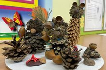 И в этом году в детском саду прошла выставка семейного творчества, в которой были представлены поделки из осенних даров: овощей и фруктов, природного материала.Это и чудесные ежики, и вазы с осенними дарами, и осенние букеты из листьев, и замечательная «Царевна Осень» и еще много, много интересных, забавных, смешных и удивительно прекрасных выдуманных родителями воспитанников сказочных героев, подарков осени, натюрмортов, экспозиций, аппликаций из листьев, поделок из даров леса и огорода.
