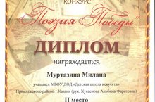 Поздравляем Муртазину Милану, ученицу театрального отделения, преподавателя А.Ф. Хусаеновой, занявшей II место в районном конкурсе "Поэзия Победы" категории "Поэт Победы- больше чем поэт!"