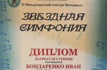 8 апреля 2017 года в ДМШ №3 имени Р.Яхина состоялся II Международный конкурс-фестиваль "Звездная симфония ", в котором достойно принял участие ученик ДШИ Приволжского района - Бондавренко Иван (класс преподавателя - Резеды Абдрауфовны Саттаровой) и стал ЛАУРЕАТОМ III СТЕПЕНИ! МОЛОДЕЦ!!! ПОЗДРАВЛЯЕМ!!!