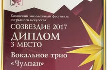 Сегодня, 16 марта 2017 года в Концертном зале Деревни Универсиады состоялся Городской этап молодежного фестиваля эстрадного искусства "Созвездие", в котором приняли участие - Вокальное трио "Чулпан" под руководством Захиды Ибрагимовны Зайнуллиной, концертмейстер А.Р.Нурмухаметов, и завоевали 3 МЕСТО.