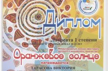 С 15-19 июня 2016 года в Республике Крым в г. Судак, при поддержке Общественного фестивального движения "Дети России", Фонда поддержки и развития детского и юношеского творчества "Лира", проходил Международный конкурс-фестиваль детского и юношеского творчества "Оранжевое солнце". В нем приняла участие Тарасова Виктория, ученица отделения эстрадного вокала ДШИ (руководитель Р.Р.Сиразетдинова, хореограф Н.А.Максимова) и завоевала Диплом ЛАУРЕАТА I СТЕПЕНИ в номинации "Эстрадный вокал".