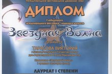 С 18-25 июня 2016 года в Республике Крым прошел V-Юбилейный Международный фестиваль-конкурс искусств "Звездная волна", где приняла участие ученица нашей школы Виктория Тарасова (руководитель Р.Р.Сиразетдинова) и стала ЛАУРЕАТОМ I СТЕПЕНИ в номинации "Эстрадный вокал". Р.Р.Сиразетдиновой вручено Благодарствнное письмо за высокий уровень подготовки участника фестиваля и весомый вклад в развитие художественного творчества и духовно-нравственного воспитания детей и молодежи. МОЛОДЦЫ! ПОЗДРАВЛЯЕМ!