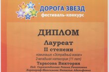 4-7 июня 2016 года в Молодежном центре "Ак Барс" прошел Международный фестиваль-конкурс исполнителей популярной музыки "Дорога звезд", в котором приняла участие ученица вокального отделения ДШИ - Виктория Тарасова (руководитель: Р.Р.Сиразетдинова, хореограф: Н.А.Максимова) и стала ЛАУРЕАТОМ II СТЕПЕНИ в номинации "Эстрадный вокал".