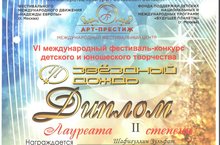 Поздравляем Шафигуллина Зульфата- аккордеон (руководитель А.Р. Хамидуллина), ставшим Лауреатом II степени VI Международного конкурса- фестиваля детского и юношеского творчества "Звездный дождь"