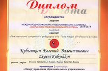 Директор Детской музыкально-хоровой школы Кубышкин Евгений Валентинович стал лауреатом III Международного конкурса педагогического мастерства «К вершинам профессионального успеха 2013-2014 г.» в номинации «Лидер управления образовательным учреждением» г. Санкт-Петербург. Конкурс проводится при участии Фонда «Петербургский центр творческой педагогики «Аничков мост» г. Санкт-Петербург, редакции журнала «Музыкальная палитра» г. Санкт-Петербург, Педагогического общества России г. Москва, Образовательного центра «Интеллект» Эстония с целью поддержки талантливых педагогических работников, пропаганды лучших методических разработок, содействия популяризации инновационных технологий и методик, способствующих совершенствованию современной педагогической науки и практики, повышению качества обучения и воспитания детей 14.07.2014