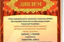 I Всероссийский фестиваль-конкурс детского и юношеского творчества "Браво,таланты!" Хаматова Алиса ДИПЛОМ Лауреата III степени.