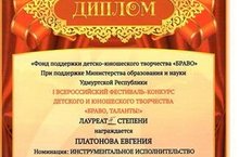 I Всероссийский фестиваль-конкурс детского и юношеского творчества "Браво,таланты!" Платонова Евгения ДИПЛОМ Лауреата III степени.