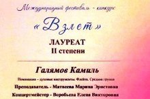 Международный фестиваль-конкурс "Взлет" номинация "Духовые инструменты. Флейта" - Галямов Камиль ДИПЛОМ Лауреата II степени.