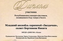 26 марта 2018 г. в ДМШ №1 им. П.И. Чайковского состоялся Республиканский концерт -фестиваль, посвященный Году театра и балета, в котором принял участие ансамбль скрипачей "Звездочки" рук. Настаушева Л.Г. конц Воробьева Е.В. и ученица 3 кл. Веселова София кл. преп Баландиной Т.К. конц Туманова М.В.. Концерт прошел успешно!